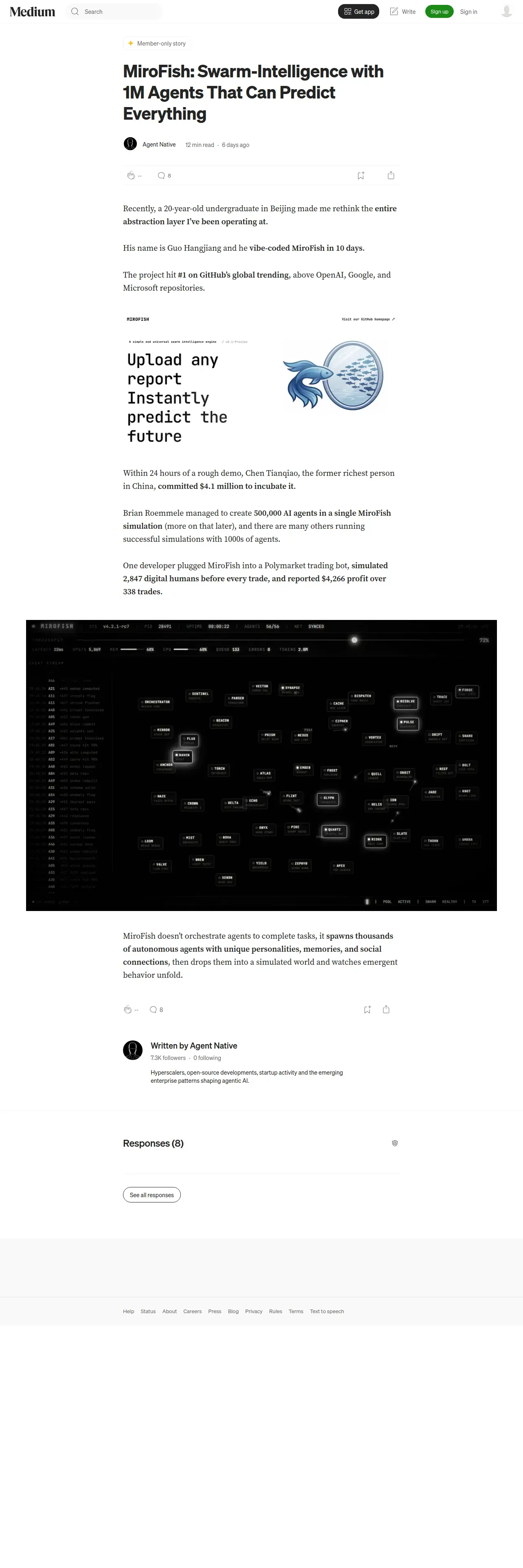 https://agentnativedev.medium.com:443/mirofish-swarm-intelligence-with-1m-agents-that-can-predict-everything-114296323663