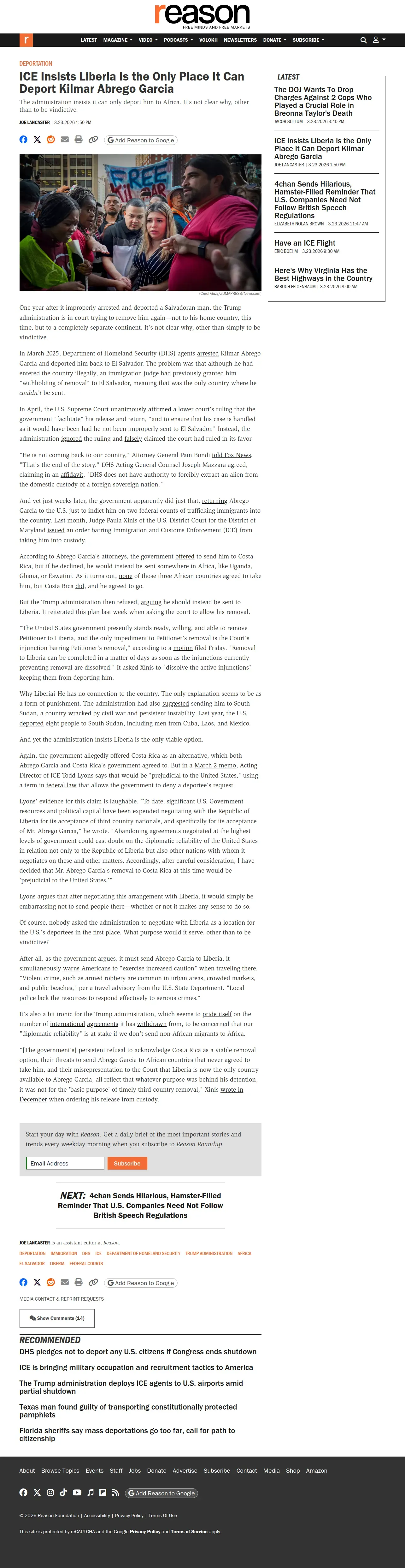取得元URL: https://reason.com:443/2026/03/23/ice-insists-liberia-is-the-only-place-it-can-deport-kilmar-abrego-garcia/