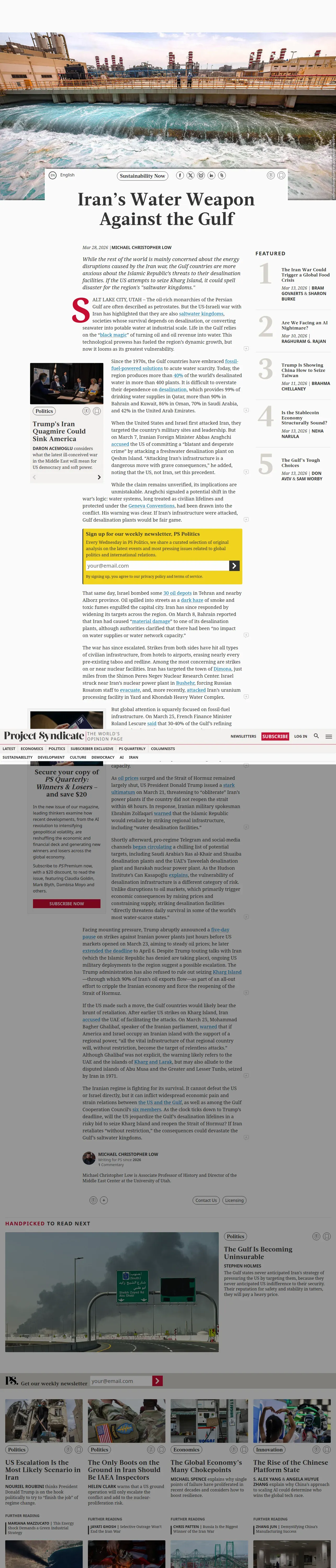 https://www.project-syndicate.org:443/commentary/us-escalation-iran-war-threatens-gulf-desalination-infrastructure-by-michael-christopher-low-2026-03