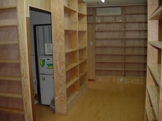 ご覧ください。2部屋をバリアフリーとし、壁を全て本棚にしてしまいました。