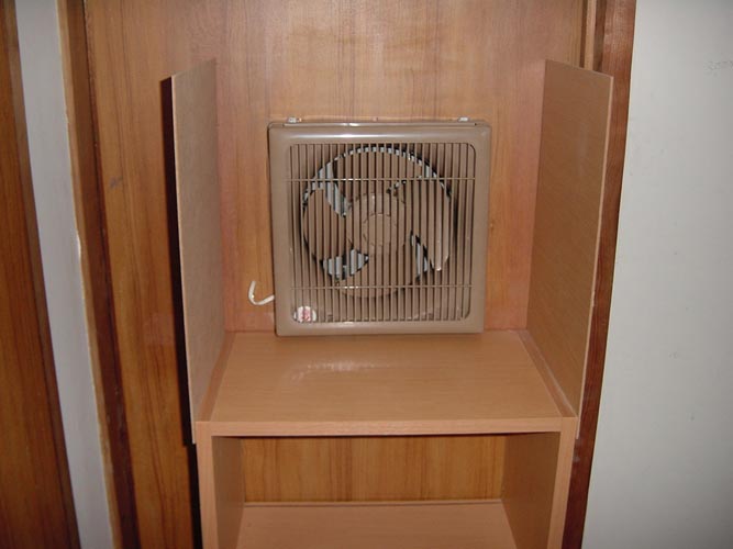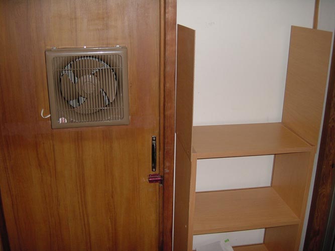 さらに注目は、この部分です。低い位置に設置した換気扇に、カラーBOXを作業台と仕切板に見立てた塗装ブース。モデラーなら誰もが夢見る設備です。