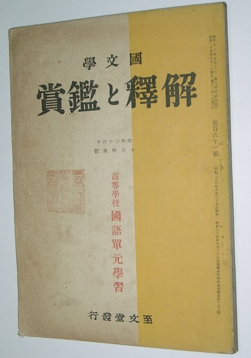 | 国文学 解釈と鑑賞 14巻10号(161号) 昭和24年10月号 | 高等学校国語単元学習、ヤケ汚、蔵印 | 藤井信男、石井庄司、久保寅夫、谷田昌平、阿部秋生、吉田精一ほか | 至文堂 | 昭和24 | \800 |