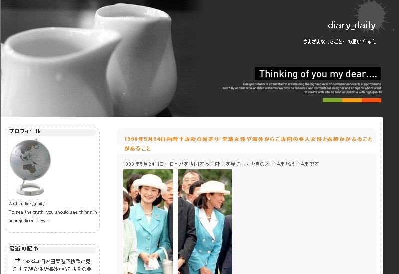 私もこのdiarydailyっていうブログ主、胡散臭いと思う。今コメントを書き込もうとしたら「禁止キーワードが含まれています」って表示されて投稿できなかった。ID:3QteRip1 No.106507 さんのおっしゃる通り、雅子さんの問題はいろいろある。衣装の話に執着しているのは最近だけど、過去のことから一つ一つ言い訳するように書いているのはずーっと前から。雅子さんのいかがわしさについてブルーフォックス氏も随分とブログ主に質問しているのに一切無視。自分のブログで自演もやってるみたいだし。自分への批判や質問は受け付けないってこと?皆さんも書き込んでみてください。