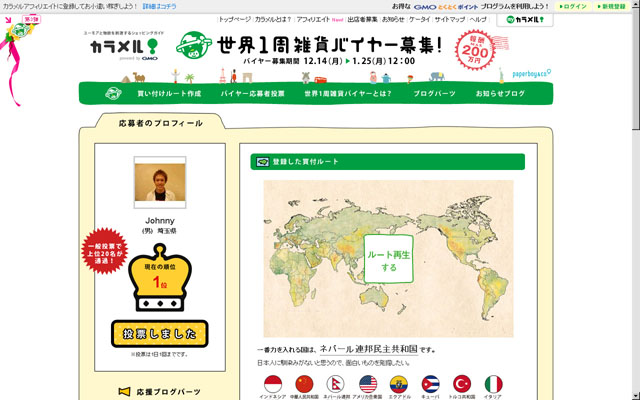 昨日書いた世界一周バイヤーのランキングのやつ、なんといつの間にか暫定1位に! http://calamel.jp/buyer/?act=route_list