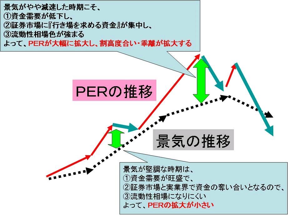 むしろ、景気がやや減速した時期こそ、資金需要が低下し、証券市場に『行き場を求めめる貪欲な資金が』集中し、流動性相場色が強まるために、PERが大幅に拡大する。
