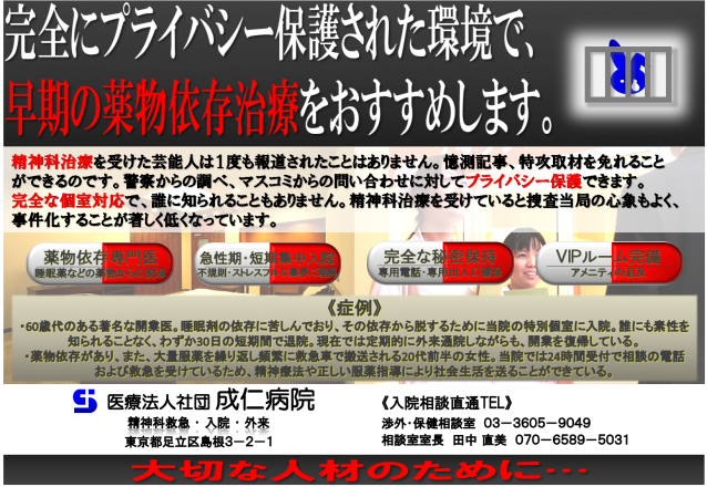 薬物依存専門医 睡眠薬などの薬物依存からの脱却をサポートします。 急性期・短期集中入院 不規則でストレスフルな業界に対応し、早期復帰を目指します。 VIPルーム完備 アメニティを追及した心地よい空間を提供します。 完全な秘密保持 専用電話・専用出入口を確保し、完全にプライバシー保護します。 |