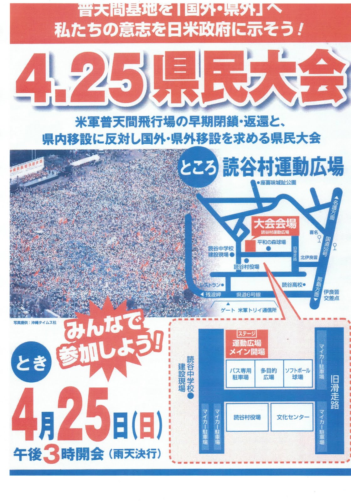 For those of us who are in North America, the Okinawan rally will start at 2 AM on Sunday 25th by the Eatern Time, and 11 PM on Saturday 24th by the Pacific Time. There will be solidarity rallies held across Japan, and in Washington., D.C., San Francisco, and Hawaii in the United States.