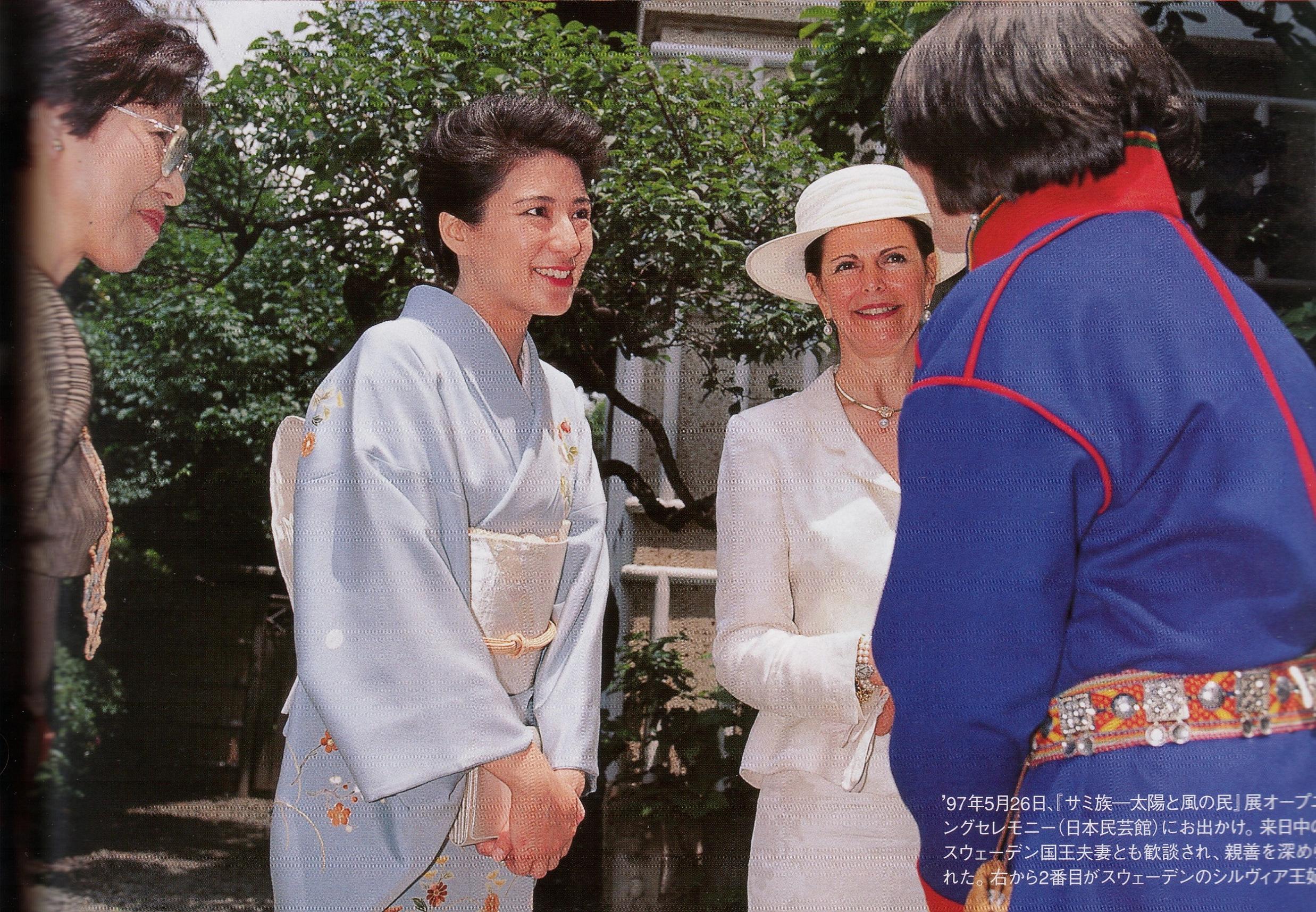 1997年5月26日 日本民芸館。「サミ族−太陽と風の民」オープニングセレモニーにお出かけの雅子様と、国王とともに来日中のスウェーデンのシルヴィア王妃。藤色に草花を描いた三つ紋付訪問着、白地の帯。どの着物を着ても短い右袖。相当はりきっているのか、雅子様の目が怖い。