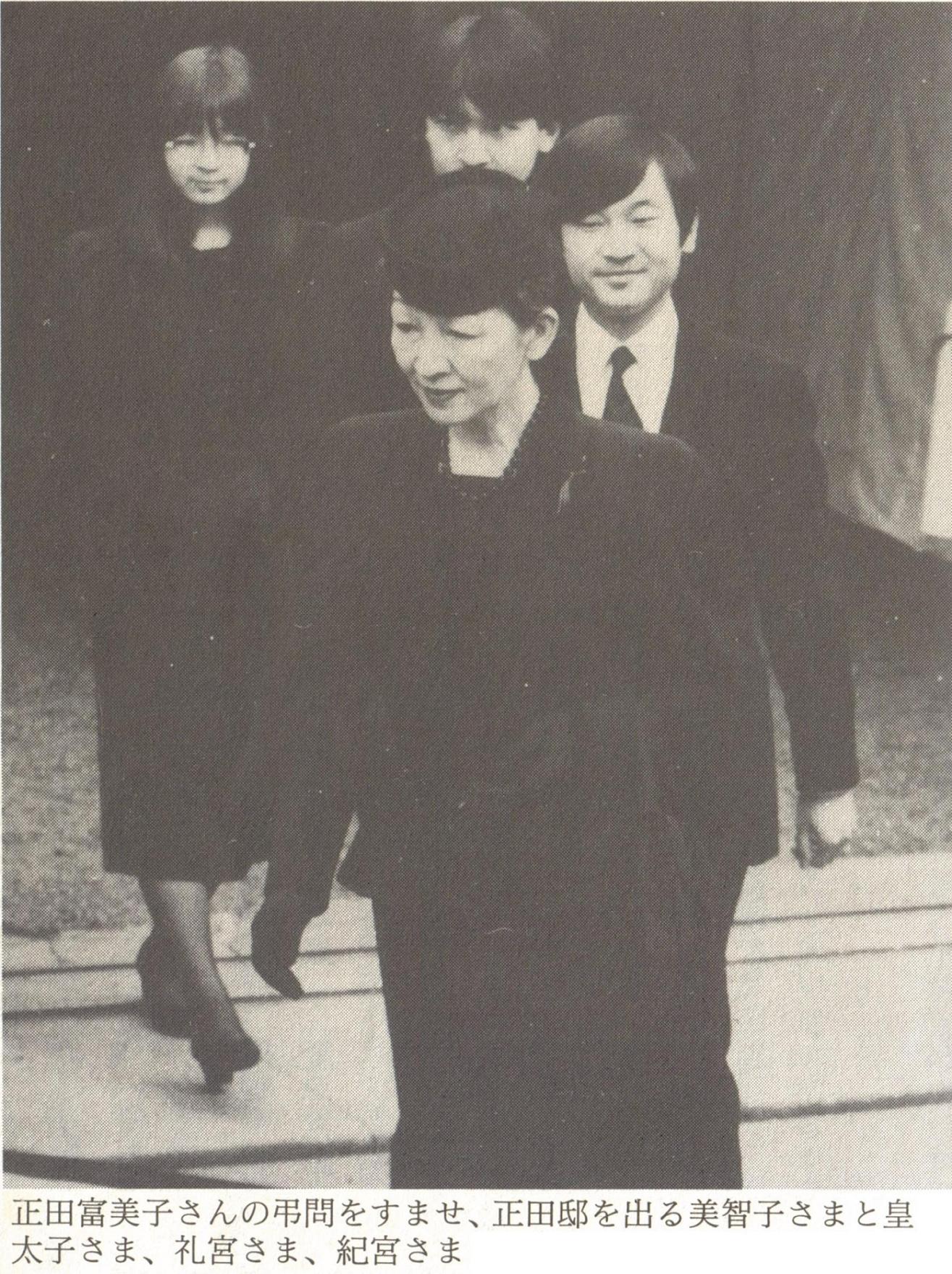 最愛の母・正田富美子さんの葬儀に向かわれる美智子様。ご臨終を看取られ、亡骸を前に目を伏せ、「お母さま、ありがとう……」1988年5月28日 午後11時3分、中央区の聖路加国際病院で死去。夜遅く亡くなったので、キャプションの28日は間違い。弔問が29日だったので、恐らく30日以降の葬儀と思われる。(未確認)参考:29日、弔問に訪れた正田邸を出られる美智子様と浩宮様、礼宮様、紀宮様。浩宮様の表情、空気読めておりません。http://www.yuko2ch.net/mako/imgbbs3jik/img-box/img20071204161929.jpg母に寄せた御歌 四照花の 一木覆いて 白き花 咲き満ちしとき 母逝き給ふ美智子様の御歌 題「彼岸花」 彼岸花 咲ける間の 道をゆく 行き極まれば 母に会ふらし