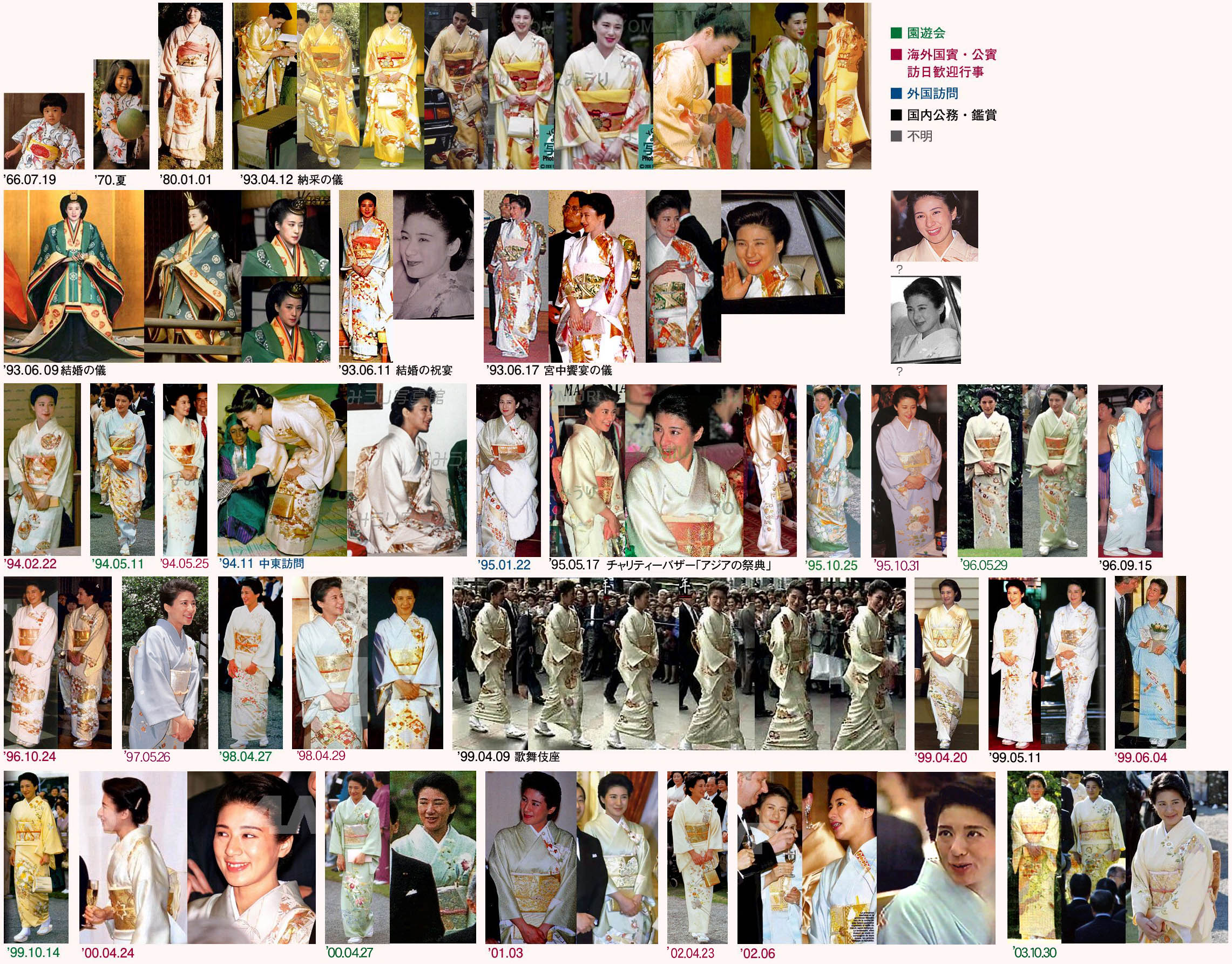 マサオさん、下段左から2枚目の青ドレスの地模様が、紀子さまがお召しのドレスと色違いで同じですね。これもある種の真似っこだったりして。