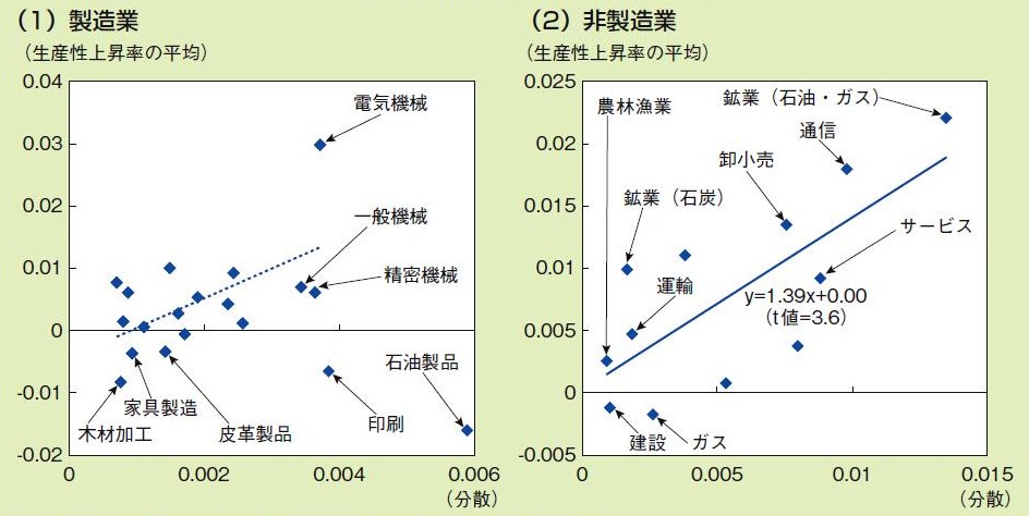 新卒一括採用については「ケースバイケース」という意見が多いようだが、それは現在の雇用慣行を前提にしてのことだろう。そもそも均質な人材をそろえる日本の雇用慣行は、生産性に貢献しているのだろうか。今年の経済財政白書に、ちょっとおもしろい調査があったので紹介しておこう。次の図は、日本の産業別の生産性(TFP)上昇率の平均と分散をみたものだ。