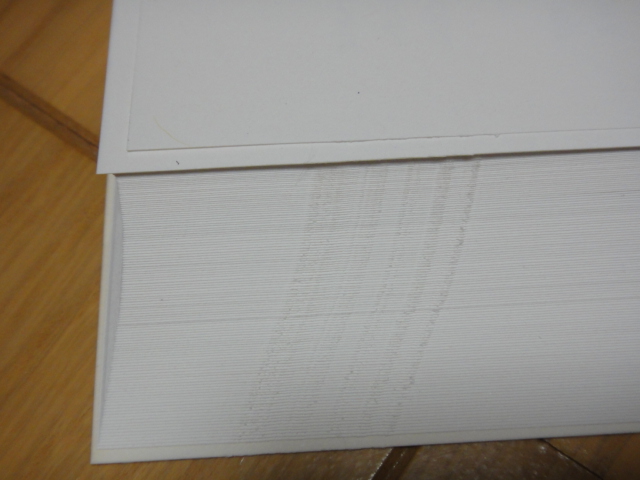 切れ味が落ちたなと感じたのは、しばらく前だったのですが、その後も裁断は無事に行えていました。ただ、裁断後の断面を見ると、それ以前と違い明らかな筋が入っていることが気になっていました。今考えれば、欠けた箇所が押し切られる感じになっているためだったのでしょう。