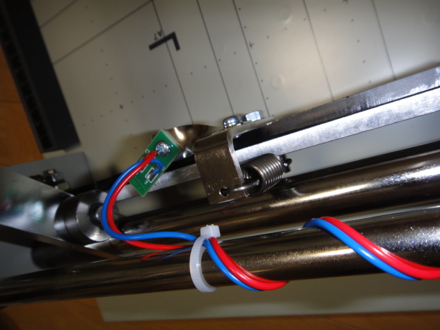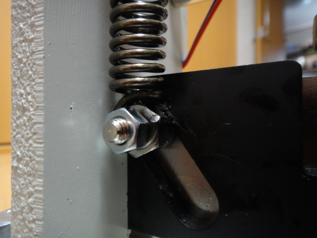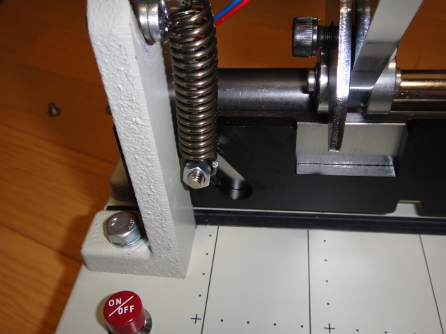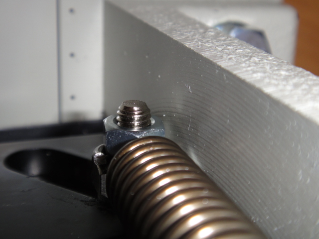 交換に於ける第一のポイントは、刃の両端をしっかりと支えている左右のボルトの外し方です。刃を止めているボルトと、バネを押さえているボルトの2段構成になっています。バネに引張上げられながら、一方で刃の自重で落ちようとする刃抑えから、このボルトを抜き取らなければなりません。スペースが狭いため、細かな作業が求められます。