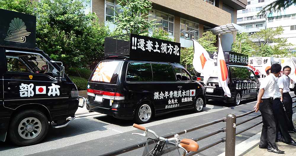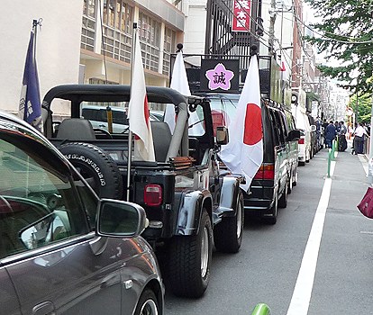 有ったとしても白いヴァン等の普通車で、黒塗り街宣車は見ていません。