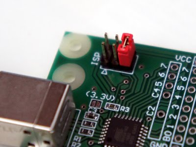 ついでに5Vと書かれた半田パッド部分も半田付けして(ハンダを盛って)ショートしておきます。これでハードウェア側の準備は完了。ジャンパピンが2つついていますが、最初の書き込みをする際には差さなくてOKです。