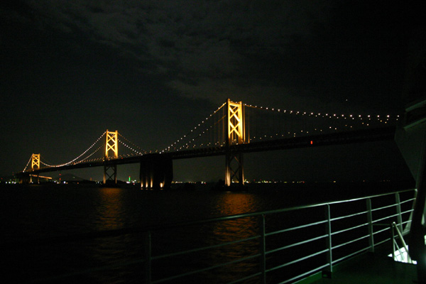 すでに日が沈み、外はだんだんと暗くなっていきます。暗くなればなるほど周りの夜景が美しくなり、橋もライトアップされていろんな輝きを見せています。