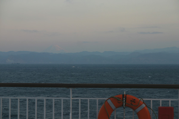 おすすめした便は普段とダイヤが異なり、天気が良ければ、大島や利島など、うっすらと見えたり、日の出と富士山(写真。左側にうっすら)を同時に見れたりと、普段と違った楽しみ方ができます。詳しくは私の乗船記(2008年6月5日より記載)を見てください。