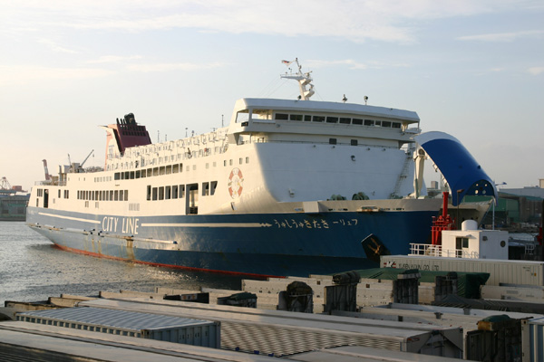 1便なのでまだまだ明るく、丁度、日が落ちそうなところでしょうか? 周りを見ると、琉球海運(沖縄方面の貨物)の「RKK LINE」と書かれている大きな貨物船があり、そのもうちょっと左にはマルエーフェリーの「琉球エキスプレス」(神戸〜大阪〜奄美大島〜たまに各島〜那覇)があります。