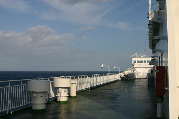 前にあるあシャーシがトラックとなり、いよいよ今度は自分の車が下船します。この位置だとさすがに早いですね。この時間帯、下にある一般乗用車の人たちは今ごろ準備段階でしょうか? もしかしたら、まだ車輌デッキに到達していない人もいるかもしれません。
