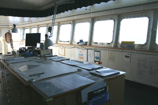 ブリッジ左側には大きな地図(昨日の記事の写真に載っています)があり、そこには今回の航海で通っていたルートを鉛筆で記しています。地図かかなり拡大されているもので、その上には三角定規などがあり、かなり細かく記されています。でも、この地図、向きが良くわからない・・・じーっと見ると、なんか角度が普通じゃないような?