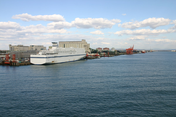 写真は、船から撮った苫小牧フェリーターミナル、左に太平洋フェリー「きそ」