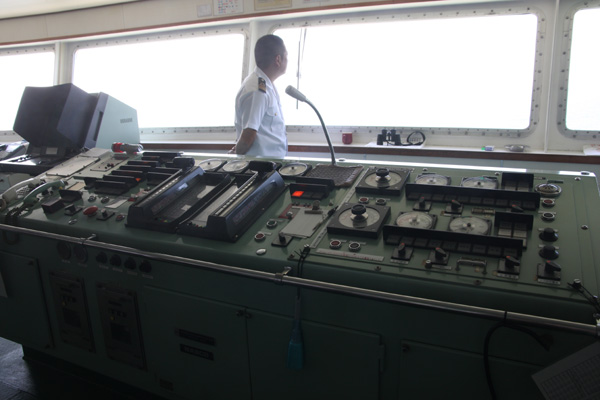 この日の天気は青空に恵まれて、波も高くなく、もちろん揺れもまったくなく、ブリッジ見学日和でした。(ブリッジは船首、最上階であるため、ちょっとでも揺れているとかなり揺れているように感じる)