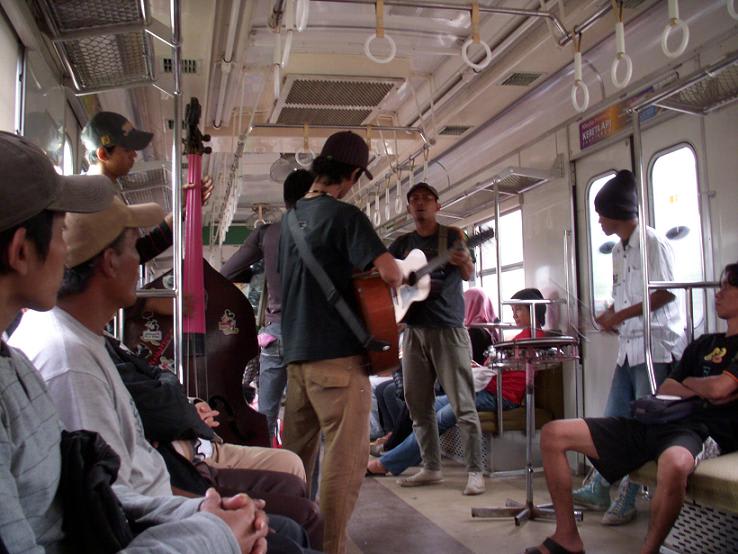 この日はBekasiからのEkonomi AC(冷房付き普通電車)に乗っているとKampung Bandan駅から乗って来て、元地下鉄東西線(東葉高速1000系)の車内でビートルズのOb-La-Di, Ob-La-Daを演奏して行きました。