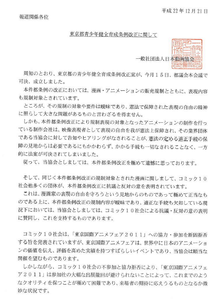 ¼çÍ×Ì¡²è½ÐÈÇ£±£°¼Ò¤¬Íèǯ£³·î¤Î¡ÖÅìµþ¹ñºÝ¥¢¥Ë¥á¥Õ¥§¥¢£²£°£±£±¡×¤Ø¤Î»²²ÃµñÈݤòɽÌÀ¤·¤¿ÌäÂê¤Ç¡¢Æ±¥Õ¥§¥¢¤Î»ö̳¶É¤ò̳¤á¤ëÆüËÜÆ°²è¶¨²ñ¤Ï£²£±Æü¡¢¡Ö¤³¤Î¤Þ¤Þ¤Î¾õ¶·¤Ç¤Ï¼Â¼ÁŪ¤Ë¼Â¹ÔÉÔ²Äǽ¤Ê»öÂ֤ˤʤë¡×¤Èͫθ¤¹¤ëÀ¼ÌÀ¤òȯɽ¤·¤¿¡£