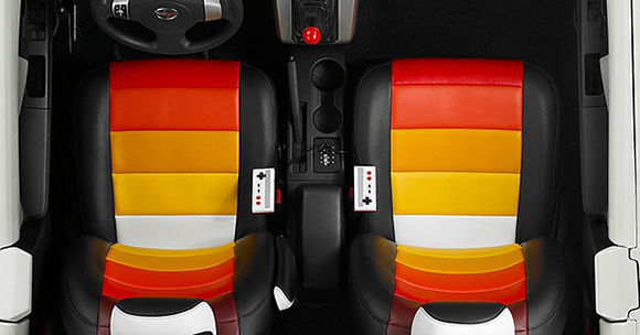 このファミコンサイオン、ヘッドライトにはプロジェクターが組み込まれ、運転席にカートリッジを差せばファミコンが楽しめるようになっています。助手席にももちろんコントローラーがあります。そしてドアを開けるとマリオのサウンドエフェクトが!?さらにテール部分にももう一つプロジェクターが装備してあるようです。