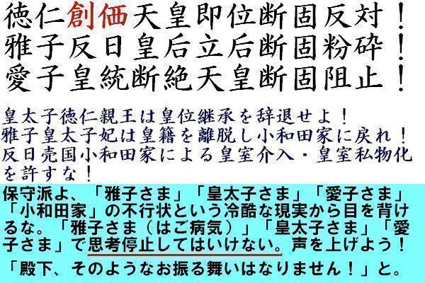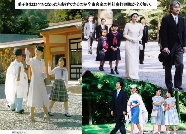 この様な中での小生の疑問は下記に集約出来ます。1)皇太子徳仁殿下に付いて御高齢の 天皇陛下、皇后陛下 のご公務に対して何等配慮の言動をなさらないのは何故か?2)雅子皇太子妃殿下に付いてなさる言動に一般的国民が理解、納得出来無い事が多いのは何故か?ご病気が原因として、何故ご療養に専念されないのか?また、日本で最高の権意ある医師団に診察なさらないのか?病状が何年も好転しないのに何時も同じコメントをするのは余りに不自然に受け取るが如何?3)愛子内親王殿下に付いて小学3年生らしい自然体にお見受け出来ない事が多い(例・・・ご挨拶、表情、行動 等)のは何故?4)畏れ多い事ですが、前述に対して「天皇家」「宮家」更には「宮内庁」「東宮家」は如何お考えなのでしょう?http://asahina-kyouko.air-nifty.com/kabu/2010/09/post-51f2.html#comment-54805725