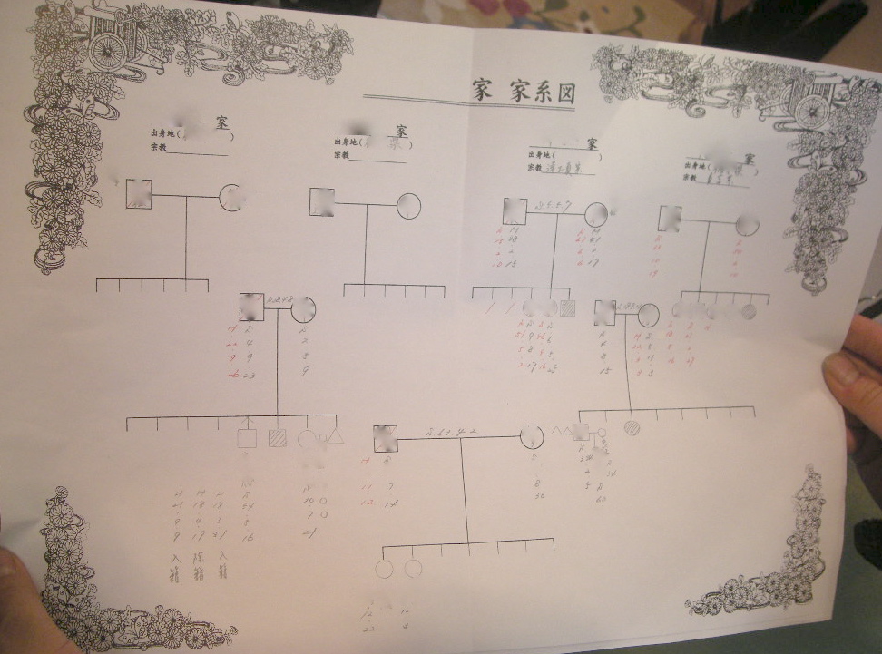 明けて2月初め、S・L・Aに連れてこられ鑑定を受けたOさん、「お気持ちで」と3千円を支払わされた。鑑定の際、有名な先生(役の信者)から「今後もっと悪くなる。今、変わらないといけない」と言われ家系図を作るように迫られ、除籍謄本を取得する為の委任状を書かされた。その後数回S・L・Aに通ったOさん、家系図作成の際に先生(役の信者)は「家系図を見ていたら御先祖様が頭を垂れて歩いているのが見えた」と告げたという。
