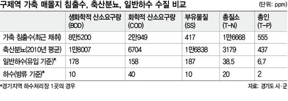 京畿道、利川市が最近 豚埋却地浸出水を採取し検査した報告書を見れば、浸出水の生化学的酸素要求量(BOD)は8万5200ppmで、高陽市一山下水処理場の下水流入基準178ppmより何と478倍も高かった。(表参照) また、化学的酸素要求量(COD)数値は下水流入基準の132倍、総窒素(T-N) 432倍、総燐(T-P)は83倍も高かった。