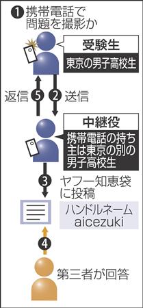 受験生のうち、東京の男子高校生の答案が「ヤフー知恵袋」での回答と酷似していたほか、投稿に使われた携帯電話の発信記録から携帯の持ち主が別の東京の男子高校生と