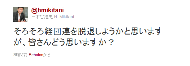 楽天の三木谷浩史会長兼社長が27日、ツイッターでこうつぶやいた。東京電力福島第一原子力発電所の事故などをめぐる日本経団連の対応に不満があるとみられる。