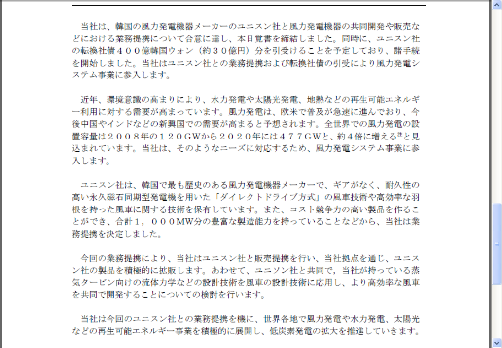 韓国の風力発電機器メーカーとの業務提携および転換社債の引受について
