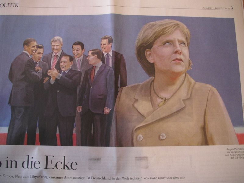 ドイツのメルケルがG8でボッチじゃないかと報じる記事のイラスト