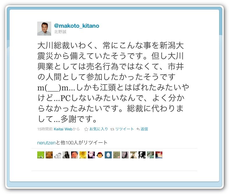 大川総裁いわく、常にこんな事を新潟大震災から備えていたそうです。但し大川興業としては売名行為ではなくて、市井の人間として参加したかったそうですm(__)m…しかも江頭とはばれたみたいやけど…PCしないみたいなんで、よく分からなかったみたいです。総裁に代わりまして…多謝です。