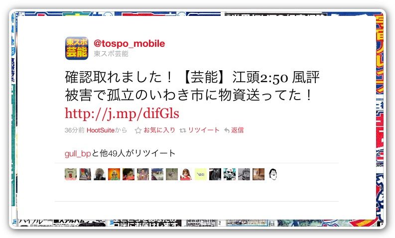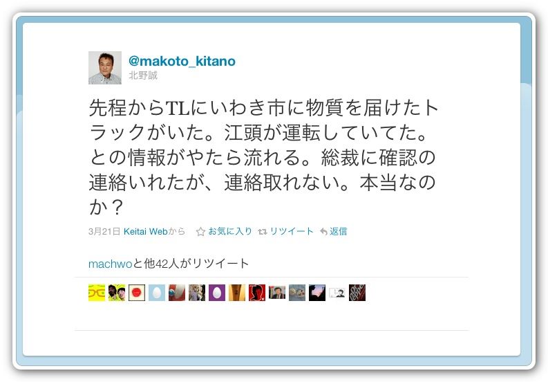 先程からTLにいわき市に物質を届けたトラックがいた。江頭が運転していてた。との情報がやたら流れる。総裁に確認の連絡いれたが、連絡取れない。本当なのか?