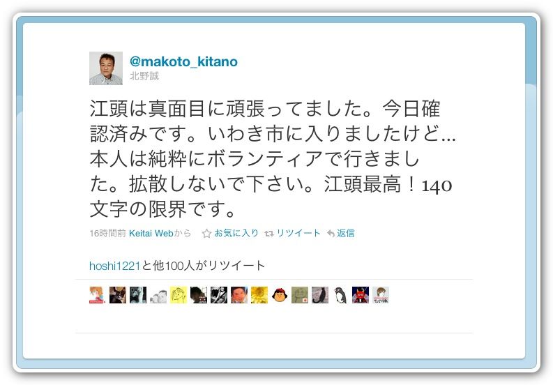 江頭は真面目に頑張ってました。今日確認済みです。いわき市に入りましたけど…本人は純粋にボランティアで行きました。拡散しないで下さい。江頭最高!140文字の限界です