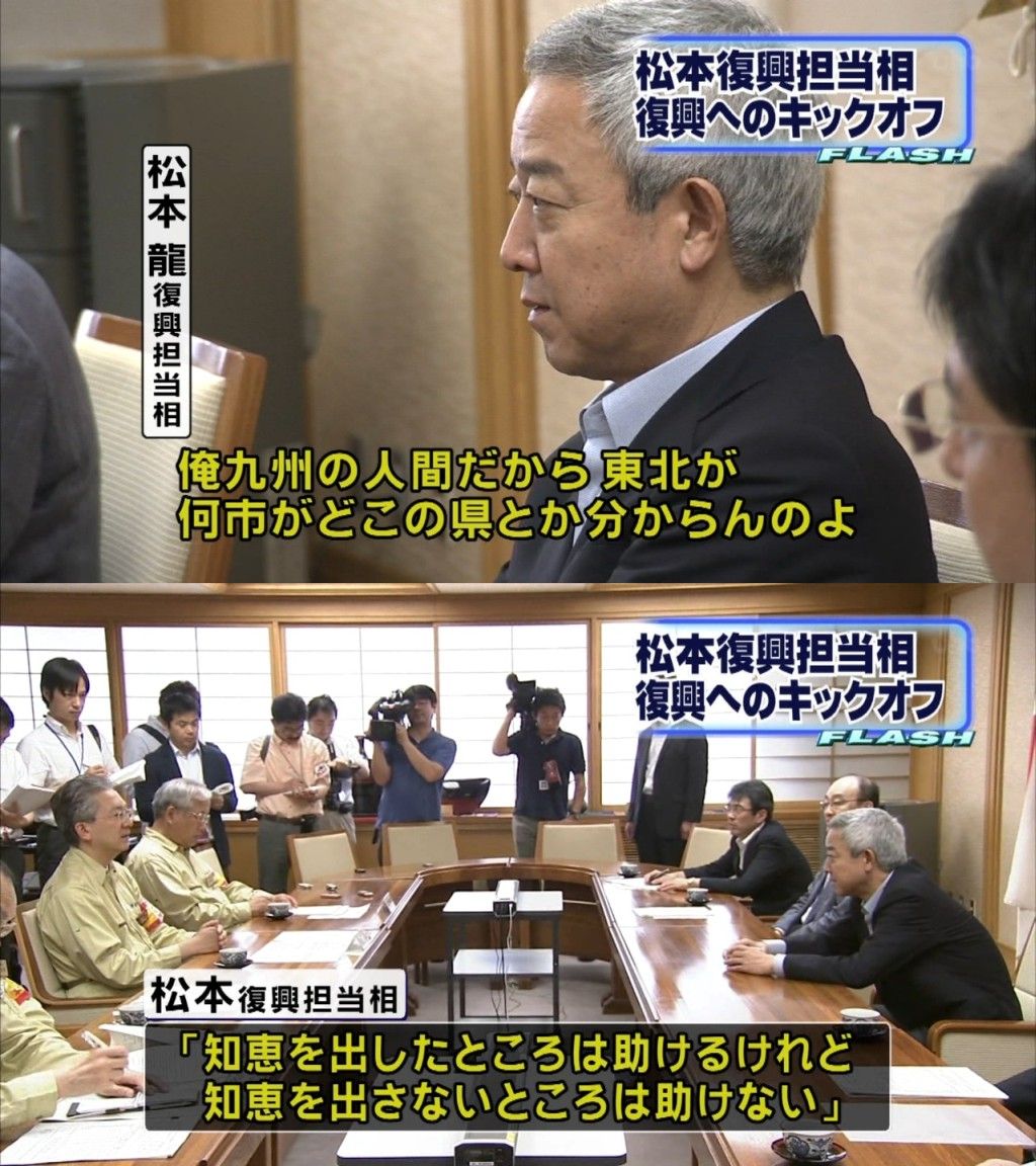 松本復興相 「(後から入った宮城県知事に)お客さんが来る時は、自分が入ってから呼べ」