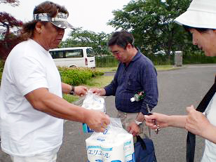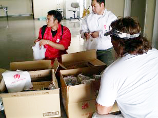 今回のお届け先は、アルプス電気株式会社様洋翔寮;約40人と、南相馬市立原町第二中学校;約100人の被災者が避難生活を送っている福島県内2ヵ所の避難所であり、長州力様をはじめとしたリキプロの皆様方の精力的な姿が見られました。