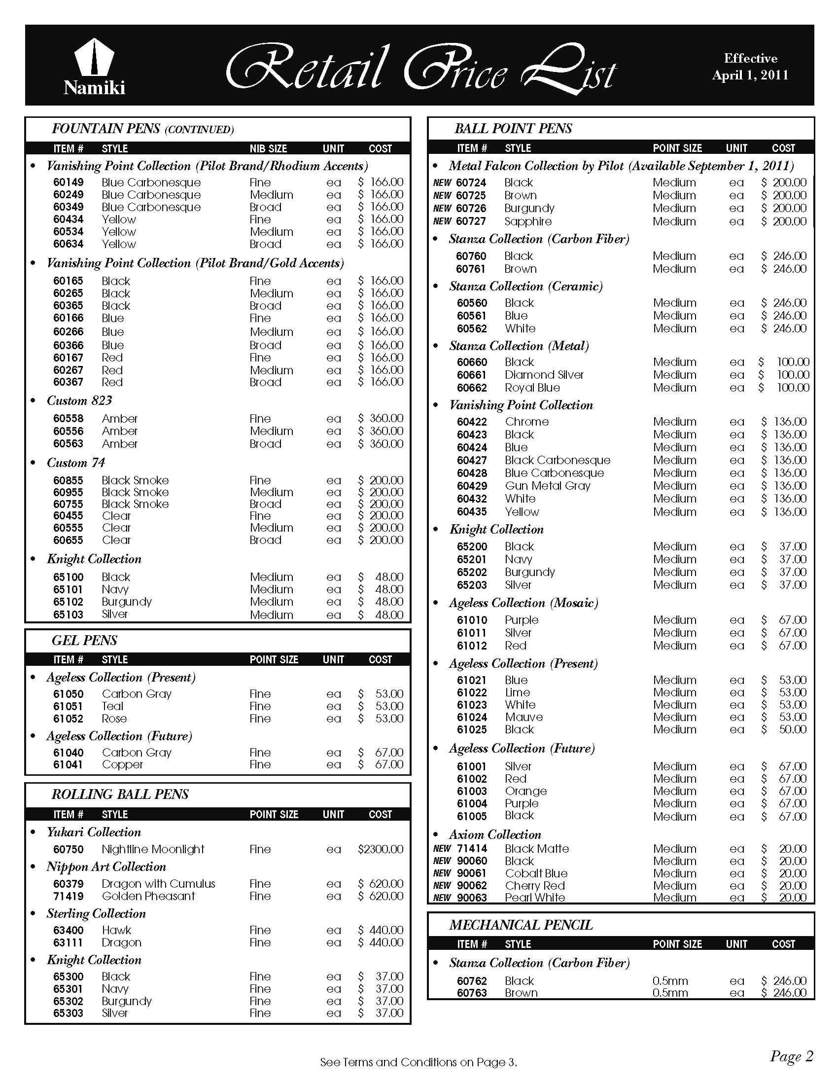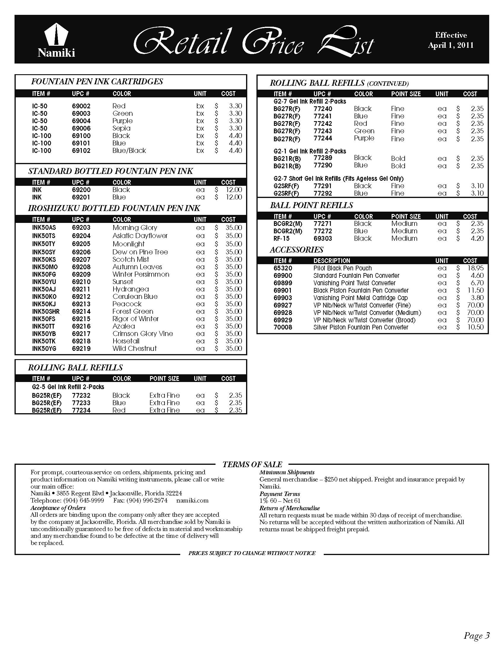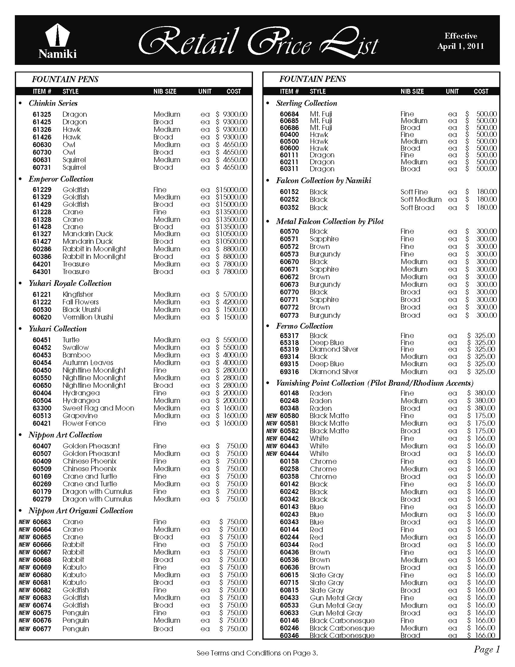米国、パイロット・ナミキ、最新価格表(2011年4月1日現在)