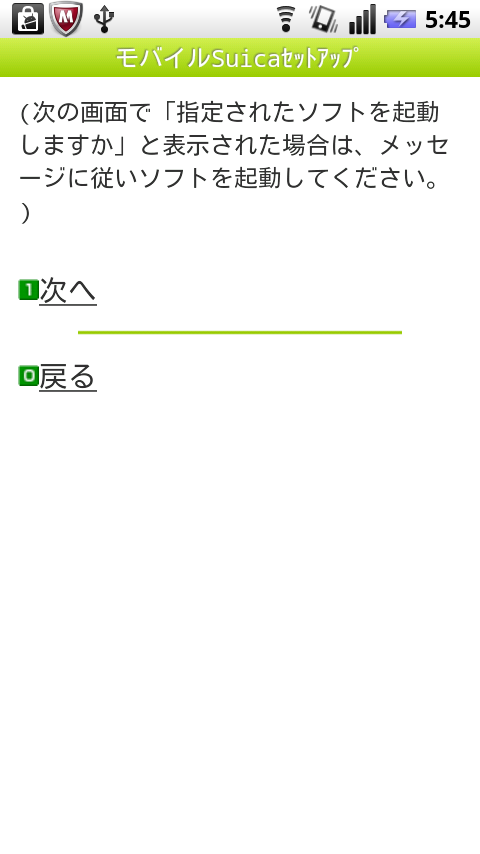 本登録処理が完了すると、モバイルSuicaとして使えるようになります。画面は携帯電話と同じ文言を原則として使っているせいか、「指定されたソフトを〜」という文言が出てきますが、ドコモのiモード端末と違って、別アプリは必要ないのでご安心下さいw