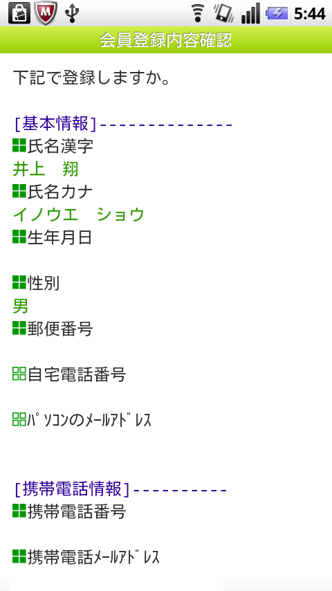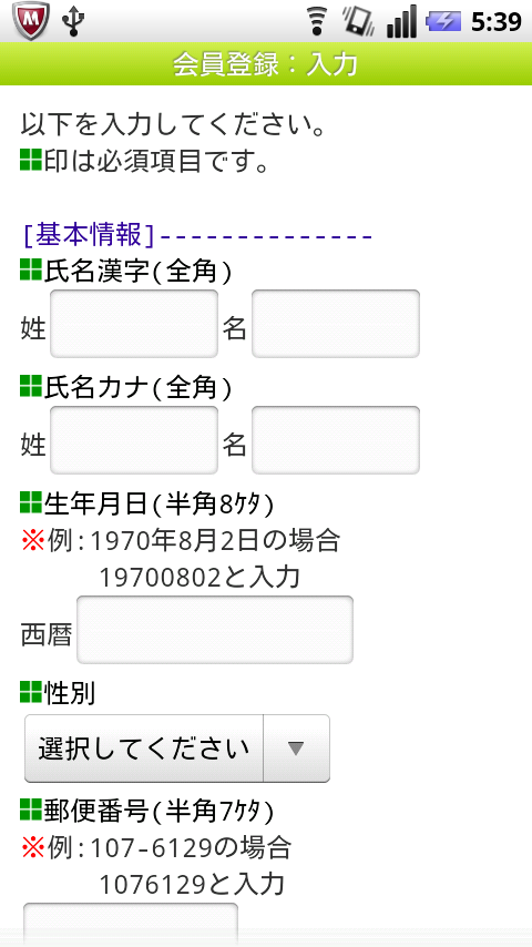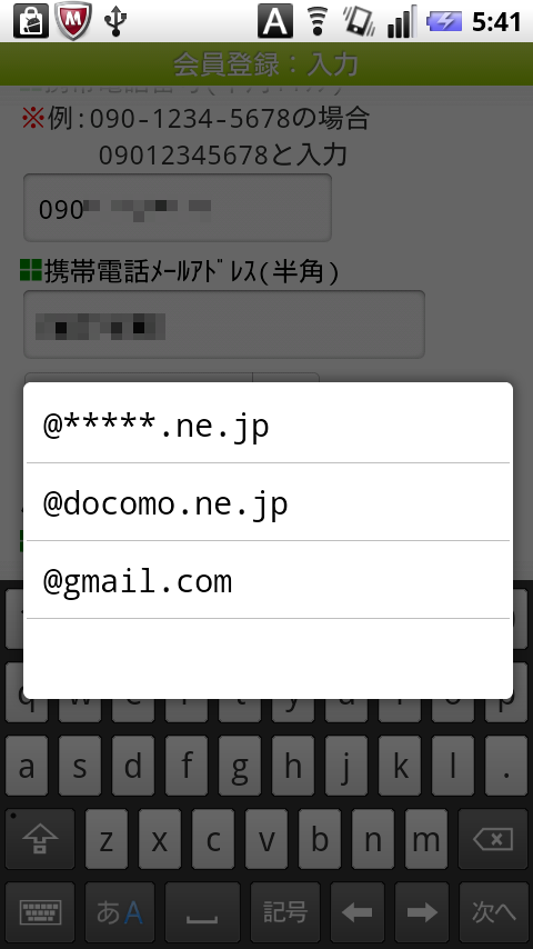 登録情報をスマートフォンで入力する場合、大体今までのケータイ版と一緒なのですが、登録する携帯電話メールアドレスのドメインにキャリアのもの(ドコモならdocomo.ne.jp)のほかにGmail(gmail.com)が増えていることがスマートフォン版らしい感じがします。