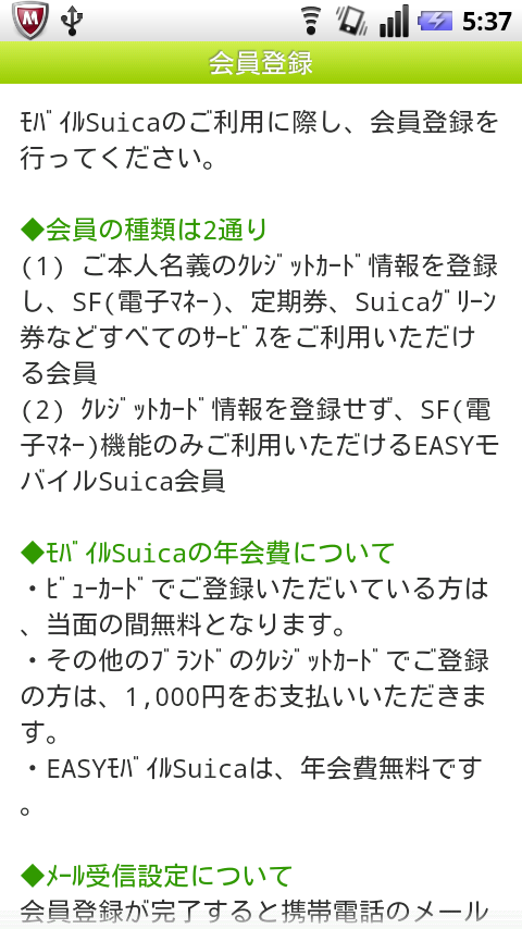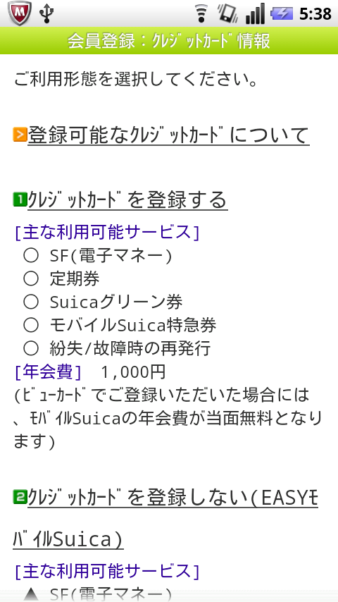 この後は、今までのiモード端末(あるいはEZweb・Yahoo!ケータイ端末)と同様にモバイルSuicaのセットアップを進めます。今回は、通常使っている、クレジットカード登録済み・通勤定期券付きのモバイルSuicaアカウントとは別に、EASYモバイルSuica(クレジットカード情報を登録しない簡易サービス)を登録してみることにしました。