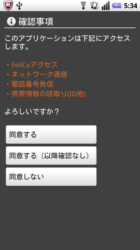 初回起動時には、モバイルSuicaアプリが端末のどんな情報にアクセスするのか確認する画面が現れます。「同意する(以後確認なし)」をタップすれば、この画面は二度と現れません。起動ごとに確認したい場合は、「同意する」をタップすればOKです。その後、初回起動時のみアプリの初期化が行われます。