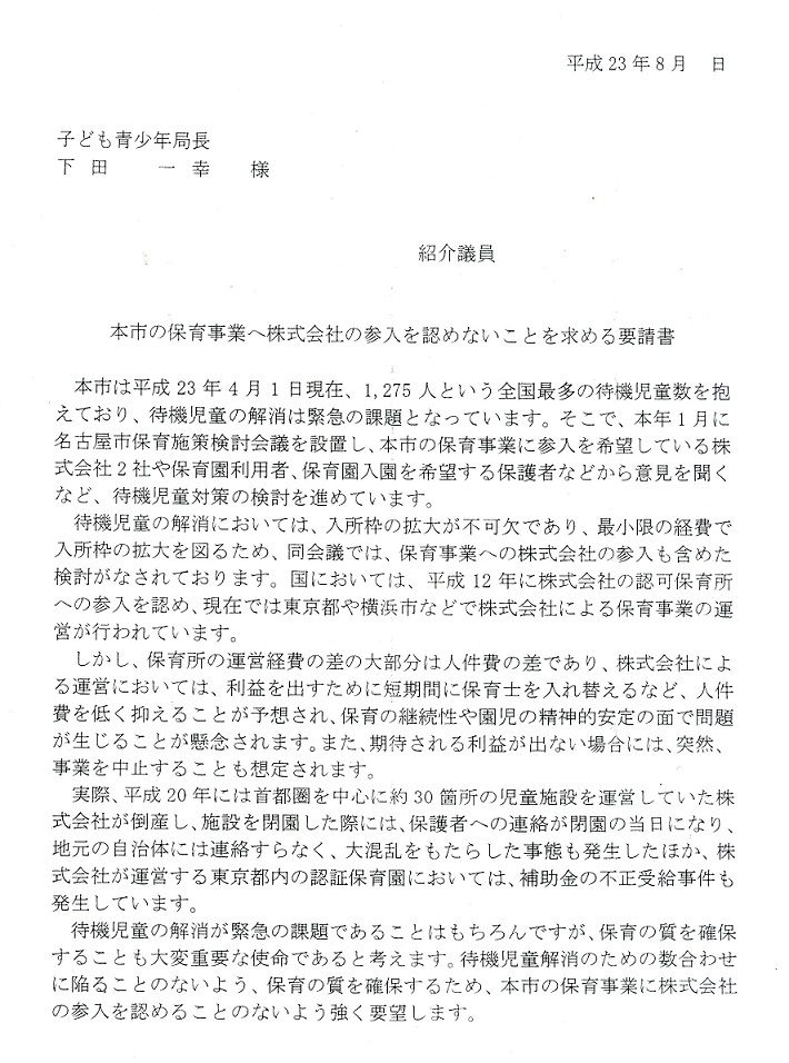 各議員から、現在、名古屋市が保育事業に株式会社の参入を検討していることに対して、慎重に対応することを求めた。また、民間保育園が独自アンケートを行ったところ、新たに900名の定員増を検討しているとの調査結果が明らかとなり、待機児童対策に一定の目途が立っていることを伝えた。