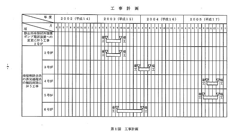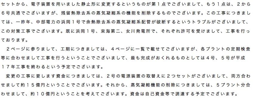 『もう1点は、2から6号共通でございますが、残留熱除去系の蒸気凝縮系の機能を削除するものでございます。この工事につきましては、一昨年、中部電力の浜岡1号で余熱除去系の蒸気凝縮系配管が破断するというトラブルがございまして、この対策工事でございます。既に浜岡1号、東海第二、女川発電所で、それぞれ許可を受けまして、工事を行っております。』