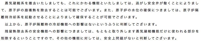 『蒸気凝縮系を撤去いたしましても、これにかわる機能といたしましては、逃がし安全弁が働くことによりまして、原子炉の崩壊熱を除去することは可能でございます。また、原子炉の水位の確保につきましては、原子炉隔離時冷却系を起動させることによりまして確保することが可能でございます。』