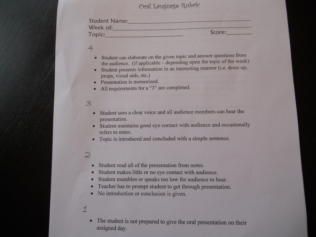 3歳くらいから、”Show & Tell" または "Sharing" と呼ばれる時間に、自分のお気に入りのおもちゃ、本などを発表する時間が週一度くらいあり、3年くらいかけて、大勢の人の前で発表すること自体に慣らせます。そして、(子供の学校の場合)2年生から本格的な発表練習となります。